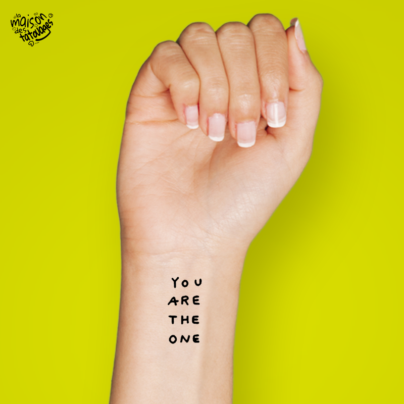 Une déclaration simple, forte et universelle. Ce tatouage typographique minimaliste aligne verticalement les mots "You Are The One", comme un mantra gravé tout en douceur. Idéal pour celles et ceux qui souhaitent rappeler (ou se rappeler) qu’ils comptent, qu’ils sont uniques, choisis, essentiels. Un clin d'œil intime, romantique ou personnel, à garder toujours près du cœur, ou à partager avec the one.