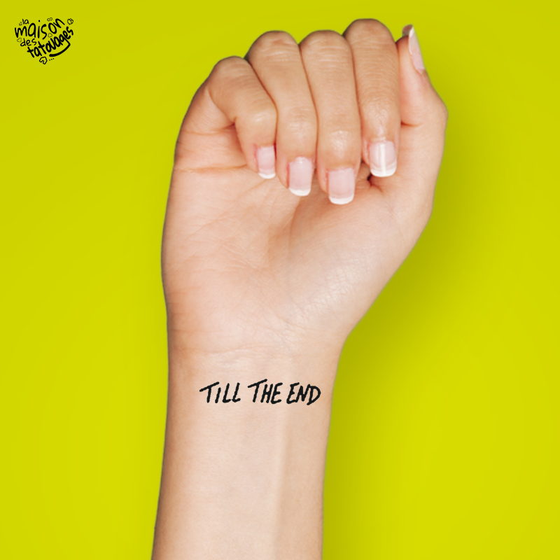 Un message simple, fort, gravé comme une promesse. Ce tatouage éphémère "Till The End" s’adresse aux âmes fidèles, aux cœurs engagés, à ceux qui avancent sans jamais reculer. Avec sa typographie manuscrite énergique, il incarne la loyauté, l’endurance et l’amour inébranlable. À porter comme un rappel de ses convictions ou un clin d'œil complice à une relation précieuse.